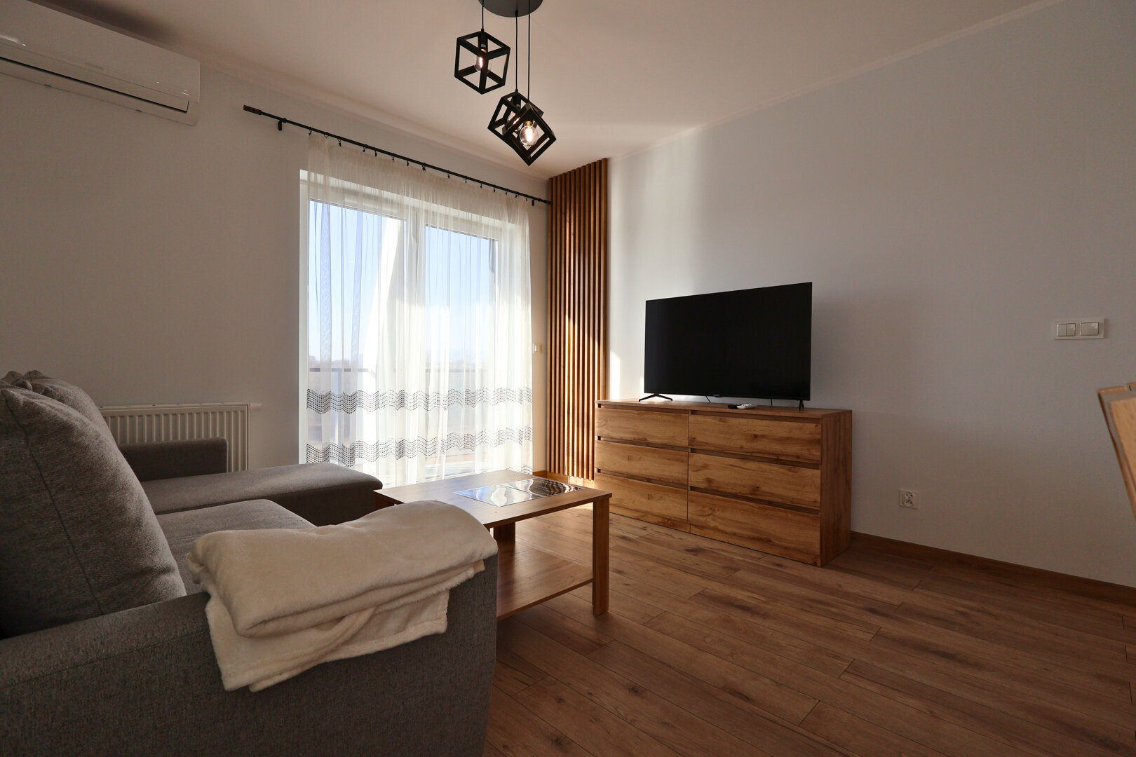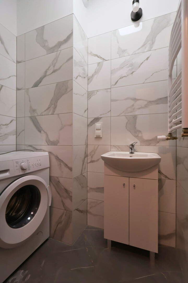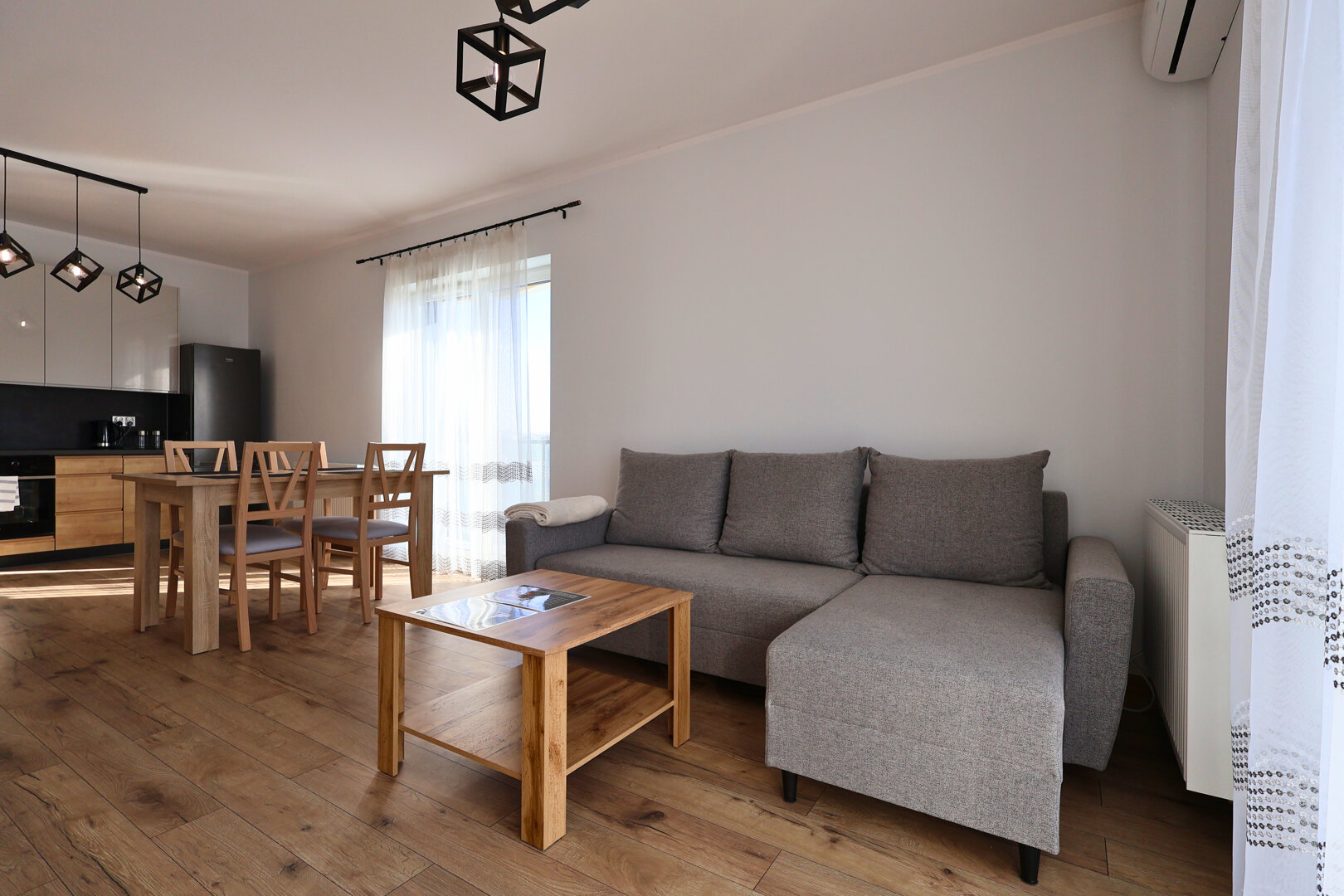 Apartament składa się z przytulnego salonu z rozkładaną sofą oraz telewizorem Smart TV, oddzielnej sypialni z dużym i wygodnym łóżkiem, a także w pełni wyposażonej kuchni z płytą indukcyjną, lodówką i zmywarką. Do dyspozycji gości jest również nowoczesna łazienka z prysznicem, pralką oraz suszarką do włosów. W całym apartamencie dostępne jest ogrzewanie oraz szybkie Wi-Fi. Mieszkanie znajduje się w nowoczesnym budynku z windą i monitoringiem, co zapewnia komfort oraz bezpieczeństwo.